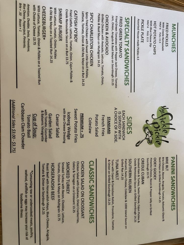 The menu at The Fickle Pickle features a variety of tantalizing dishes, including our famous Cajun Fried Pickles and Hot Potato Chips with blue cheese dip. Indulge in our Specialty Sandwiches like the Fried Green Tomato or the Catfish Po' Boy, each bursting with unique flavors and perfectly paired ingredients. For a lighter option, try one of our Cold Sandwiches such as the Chicken Salad on Croissant or the Horseradish Beef.